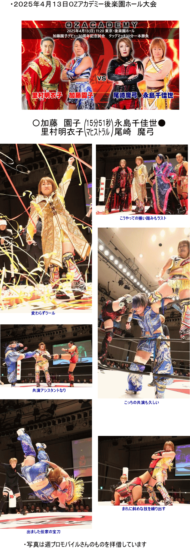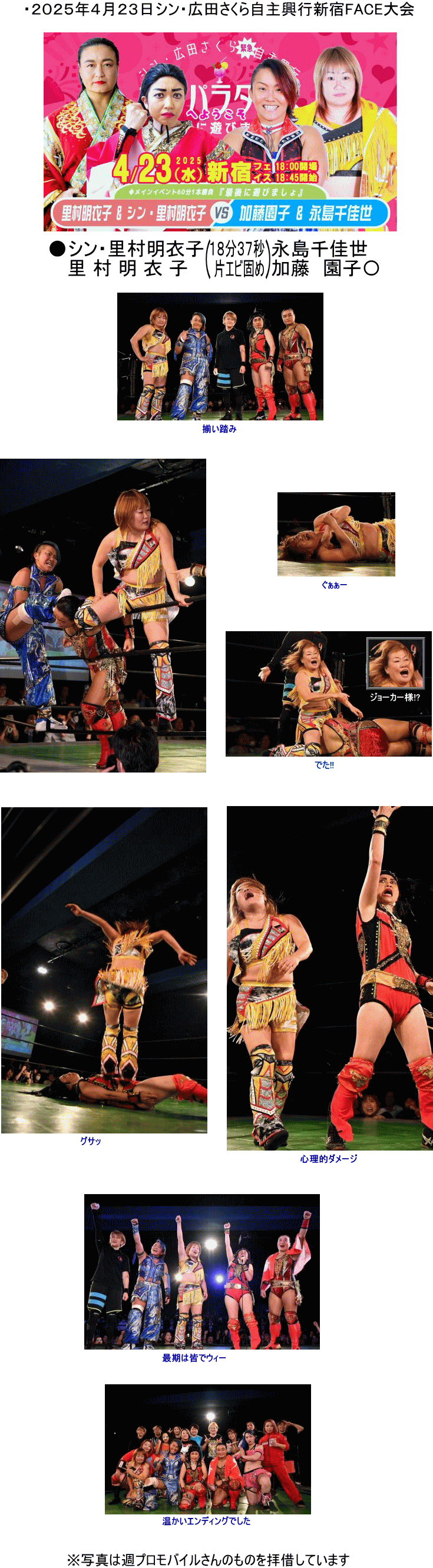 | ・第1試合 ○門倉凛 vs 桃野美桜● <14:38 逆うち> ・第2試合 ○旧姓・広田さくら vs KAORU● <13:20 催眠術からのTKO> ・第3試合 ●井坂レオ vs ○香取貴大(イーグルプロレス) <11:22 フロッグスプラッシュ> ・セミファイナル LEVEL5 ●渡辺智子&山縣優&サハラ・セブン vs W-fix 永島千佳世〇&藪下めぐみ&DASH・チサコ(センダイガールズ) <NAWASHIMA> ・メインイベント Warriors wrestling woman’s champion ship タイトルマッチ選手権試合 (挑戦者)○彩羽匠 vs ナイラ・ローズ●(チャンピオン) <スリーパー→レフリーストップ> |
