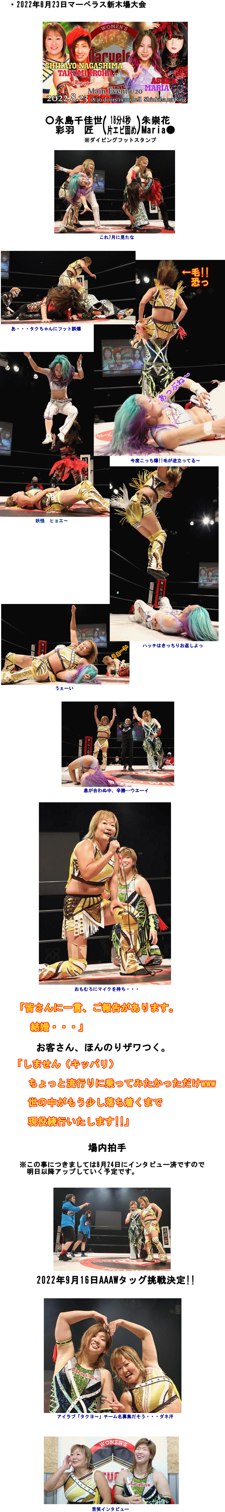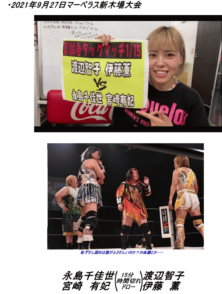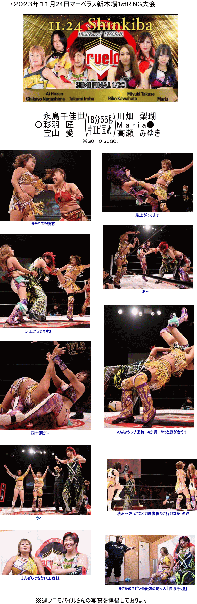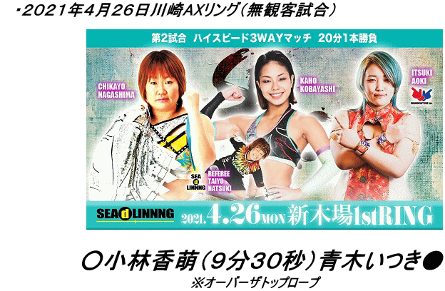 | ・第1試合 ○門倉凛 vs 桃野美桜● <14:38 逆うち> ・第2試合 ○旧姓・広田さくら vs KAORU● <13:20 催眠術からのTKO> ・第3試合 ●井坂レオ vs ○香取貴大(イーグルプロレス) <11:22 フロッグスプラッシュ> ・セミファイナル LEVEL5 ●渡辺智子&山縣優&サハラ・セブン vs W-fix 永島千佳世〇&藪下めぐみ&DASH・チサコ(センダイガールズ) <NAWASHIMA> ・メインイベント Warriors wrestling woman’s champion ship タイトルマッチ選手権試合 (挑戦者)○彩羽匠 vs ナイラ・ローズ●(チャンピオン) <スリーパー→レフリーストップ> |